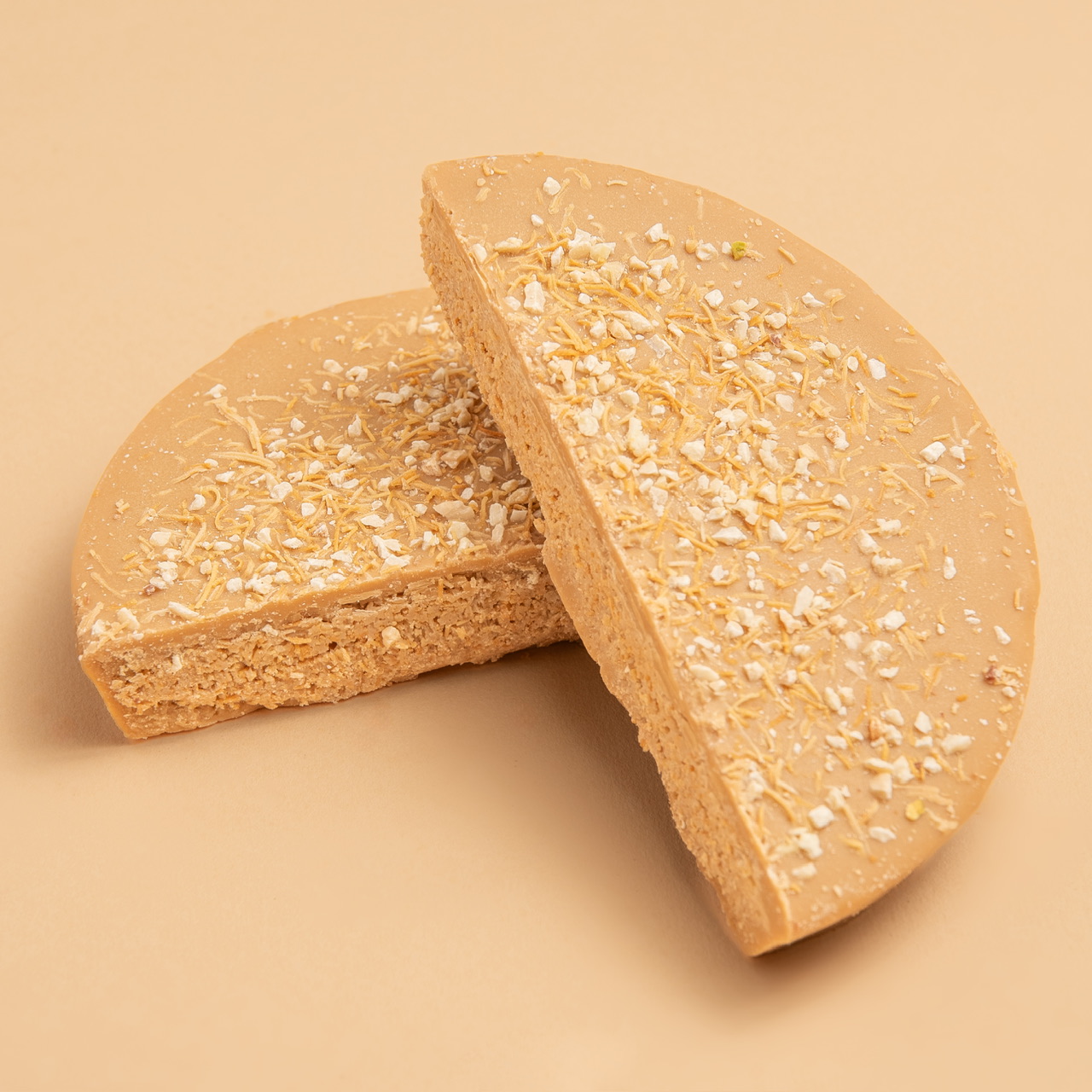 Delicate almond and kunafa cake covered with blonde chocolate.