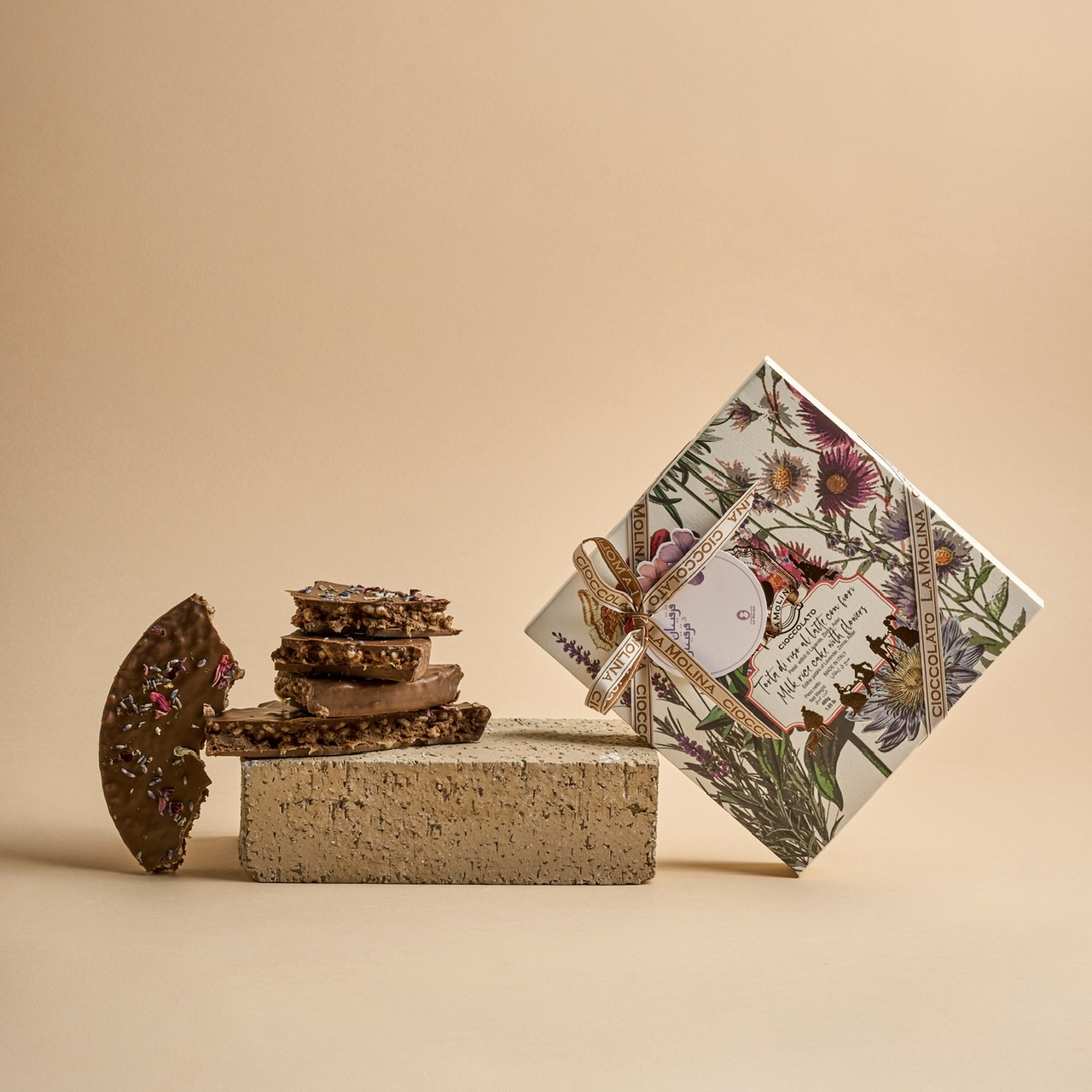 Delicate gianduja with PGI piedmont hazelnuts, rice crispies and caramel covered by milk chocolate, 1 piece bag and 1 piece name tag.