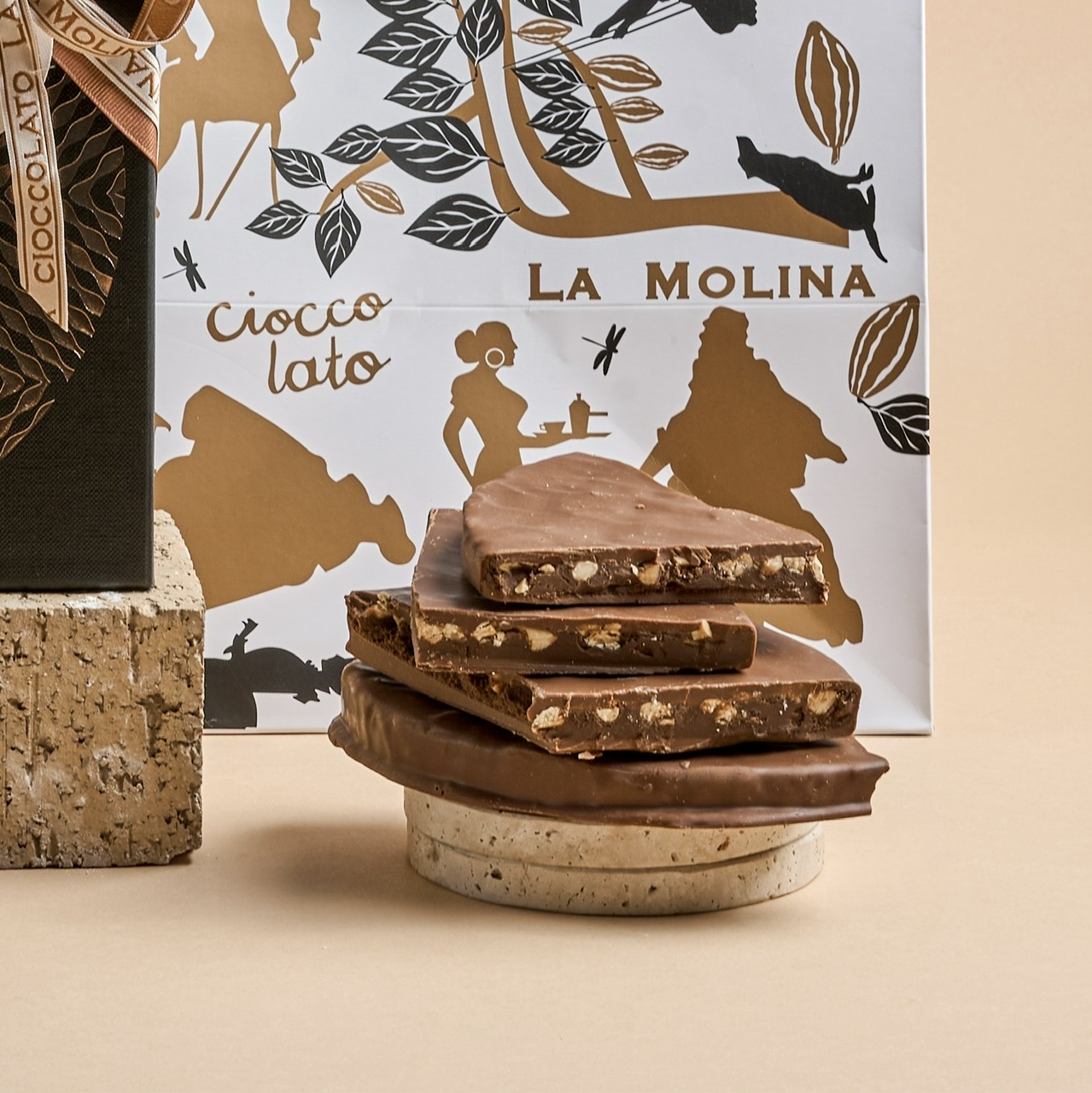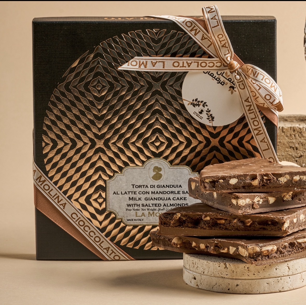 Delicate gianduja cake with salted almonds, covered with milk chocolate, 1 piece bag and 1 piece name tag.