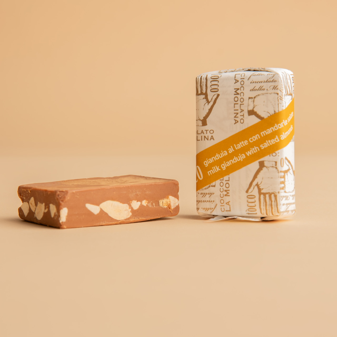 Milk gianduja with salted almonds.